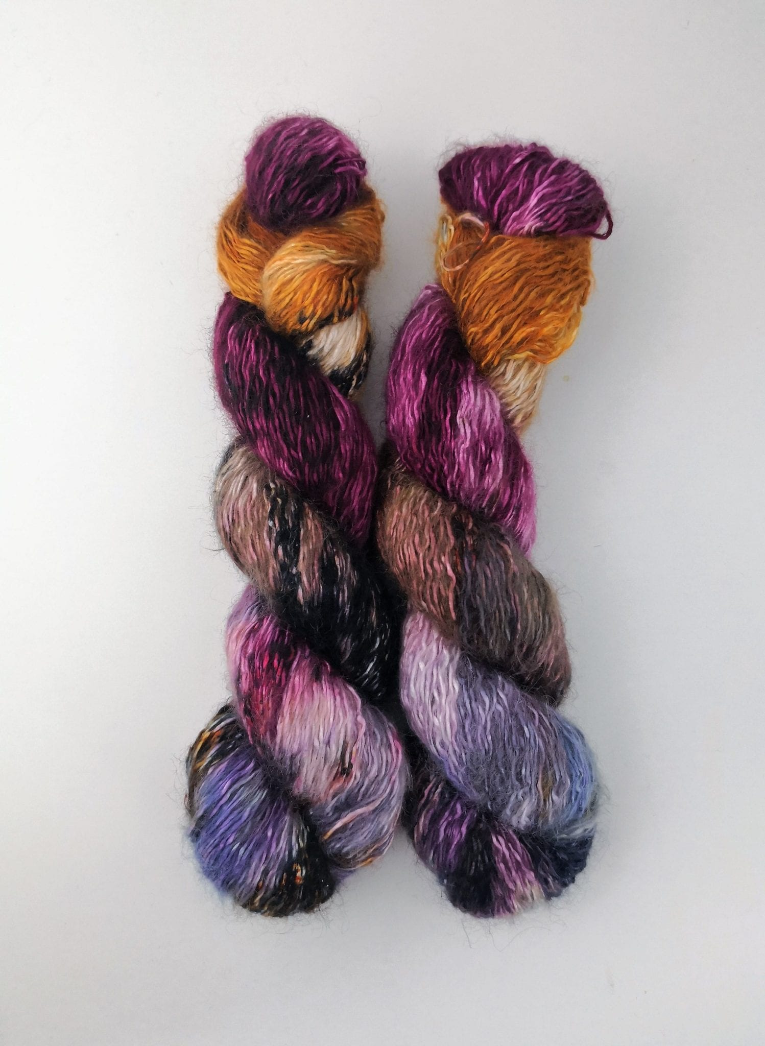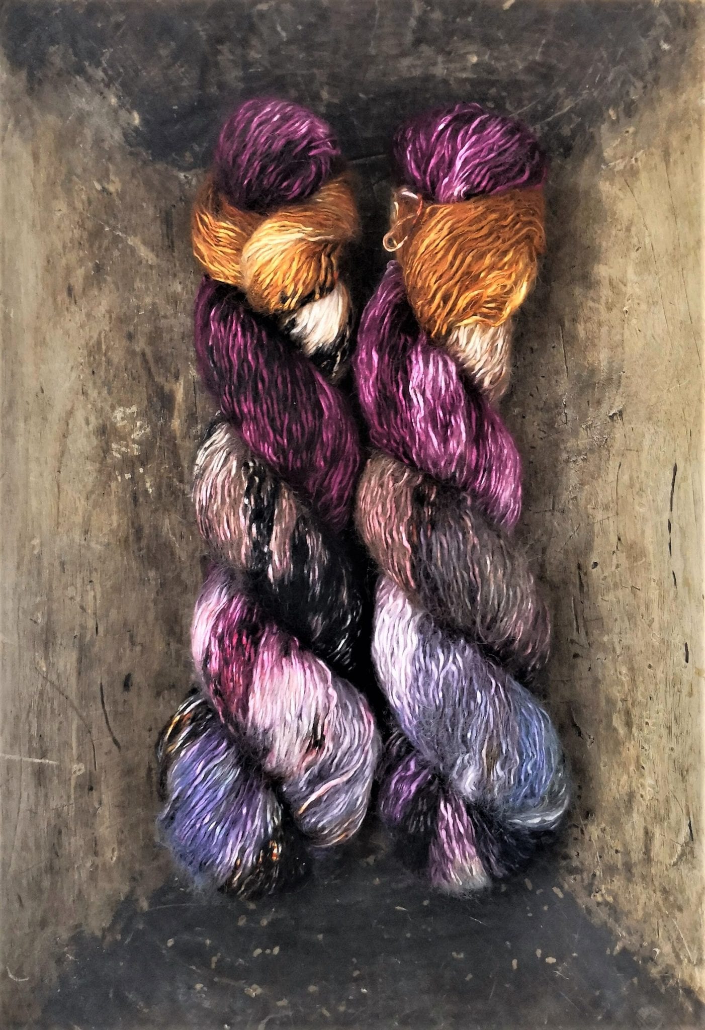 Bustin silk kid is a really luxury yarn; 69% Silk 22% Mohair 9% Polyamide in 100g Hanks. Yardage is 350m per 100g.