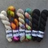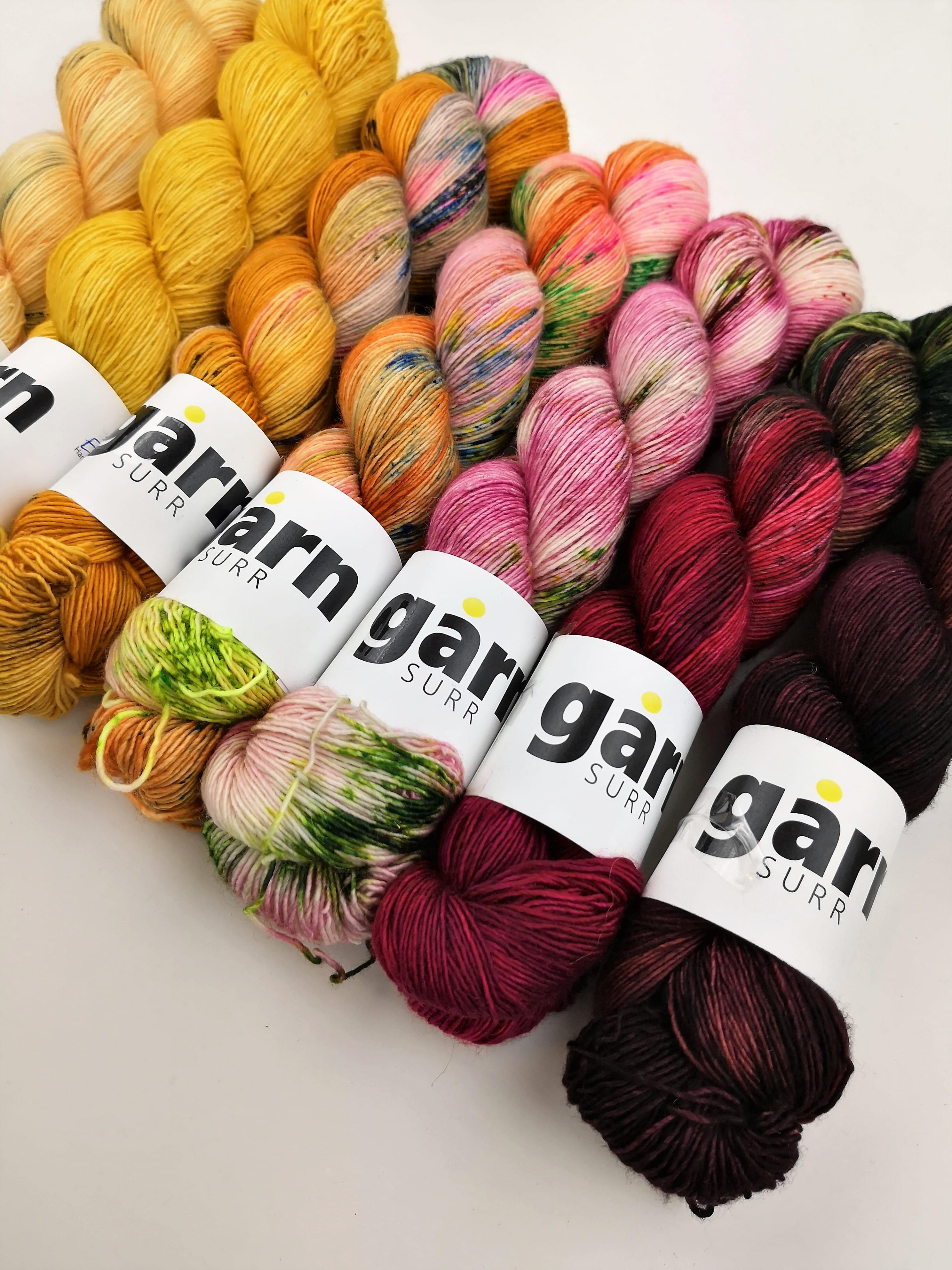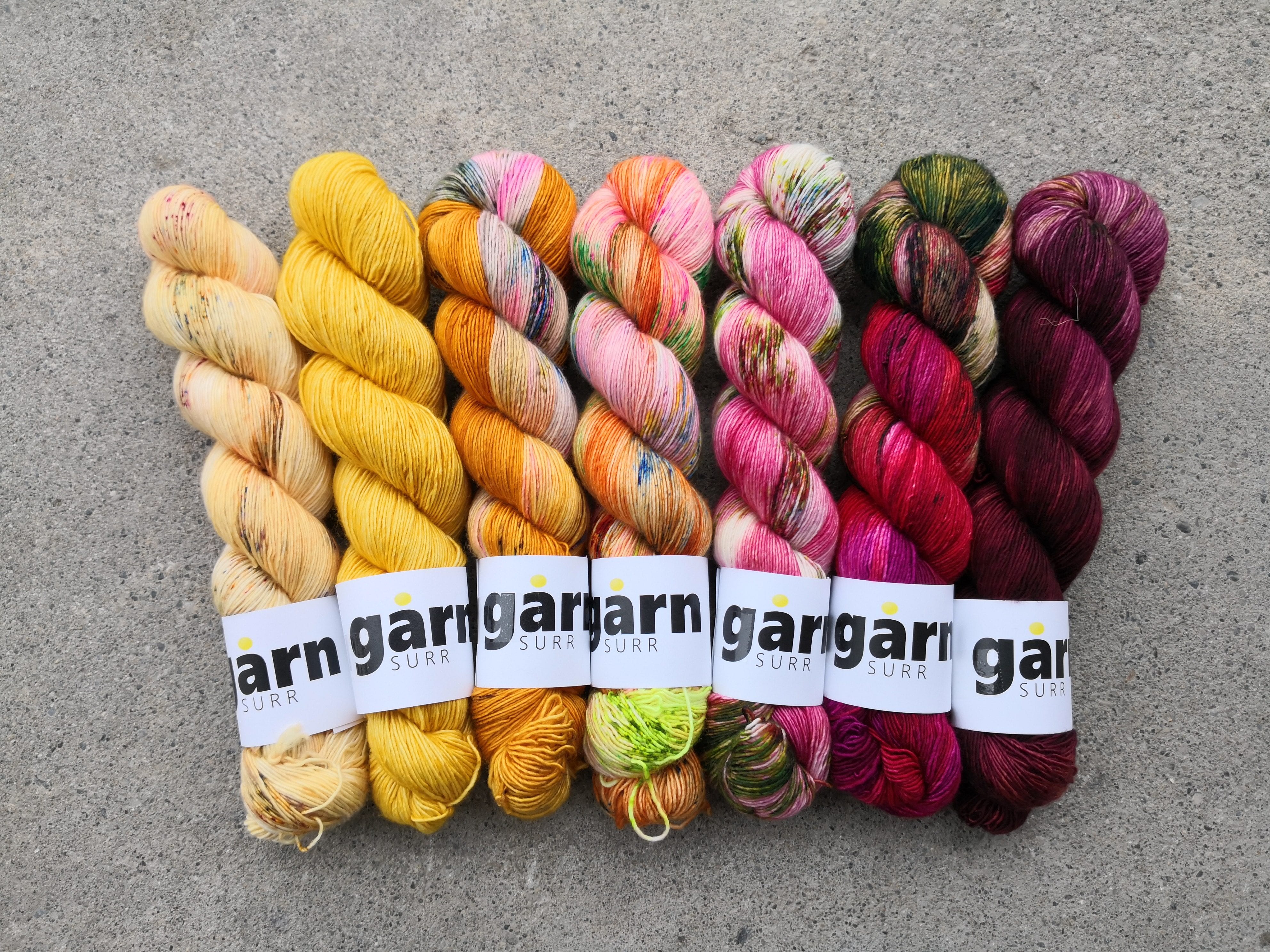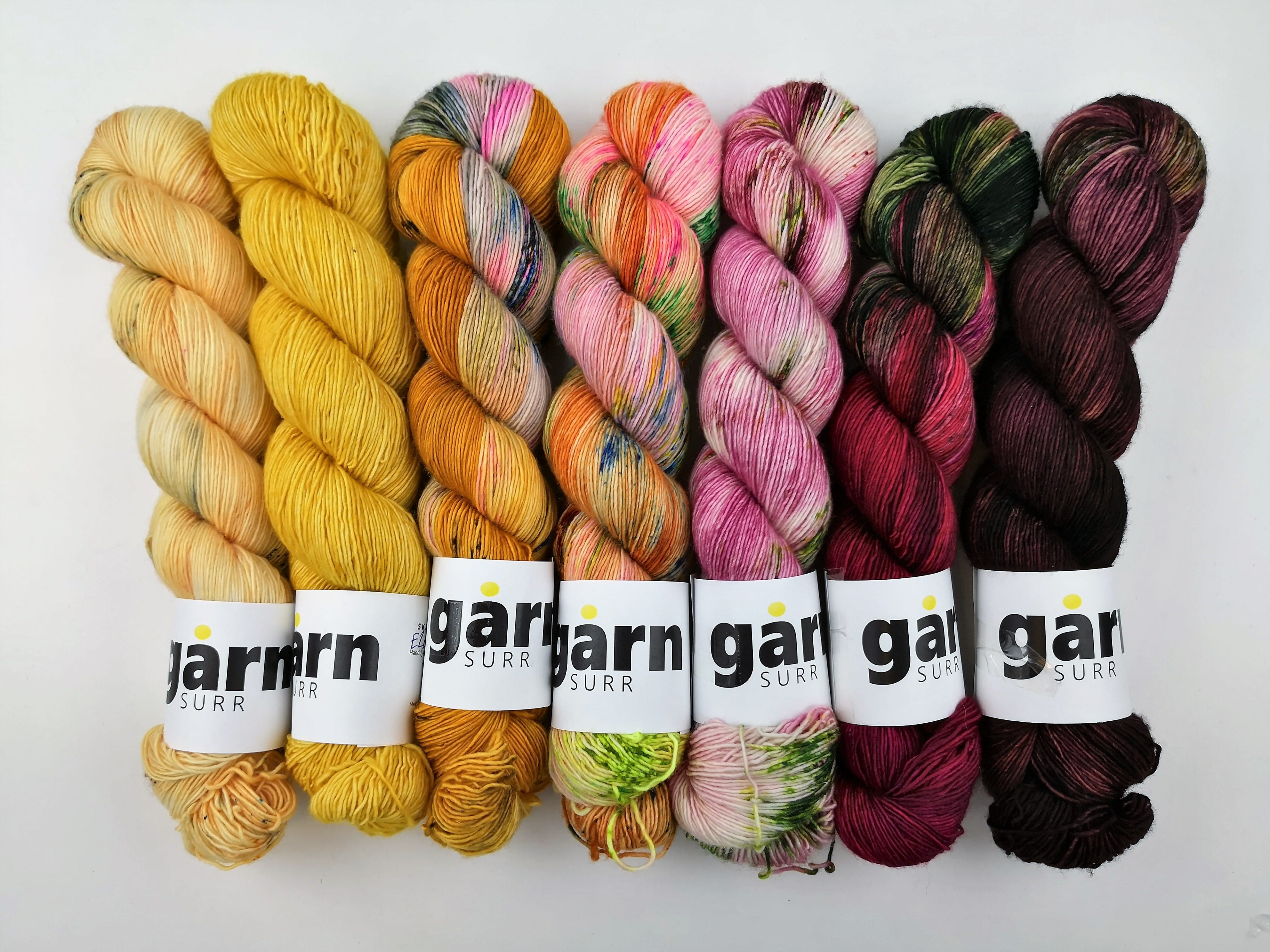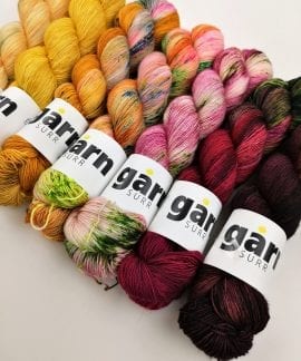 Pakken består av sju hesper skrantin merino (366 meter/100 g), og garnet er entråds 100 prosent merino..