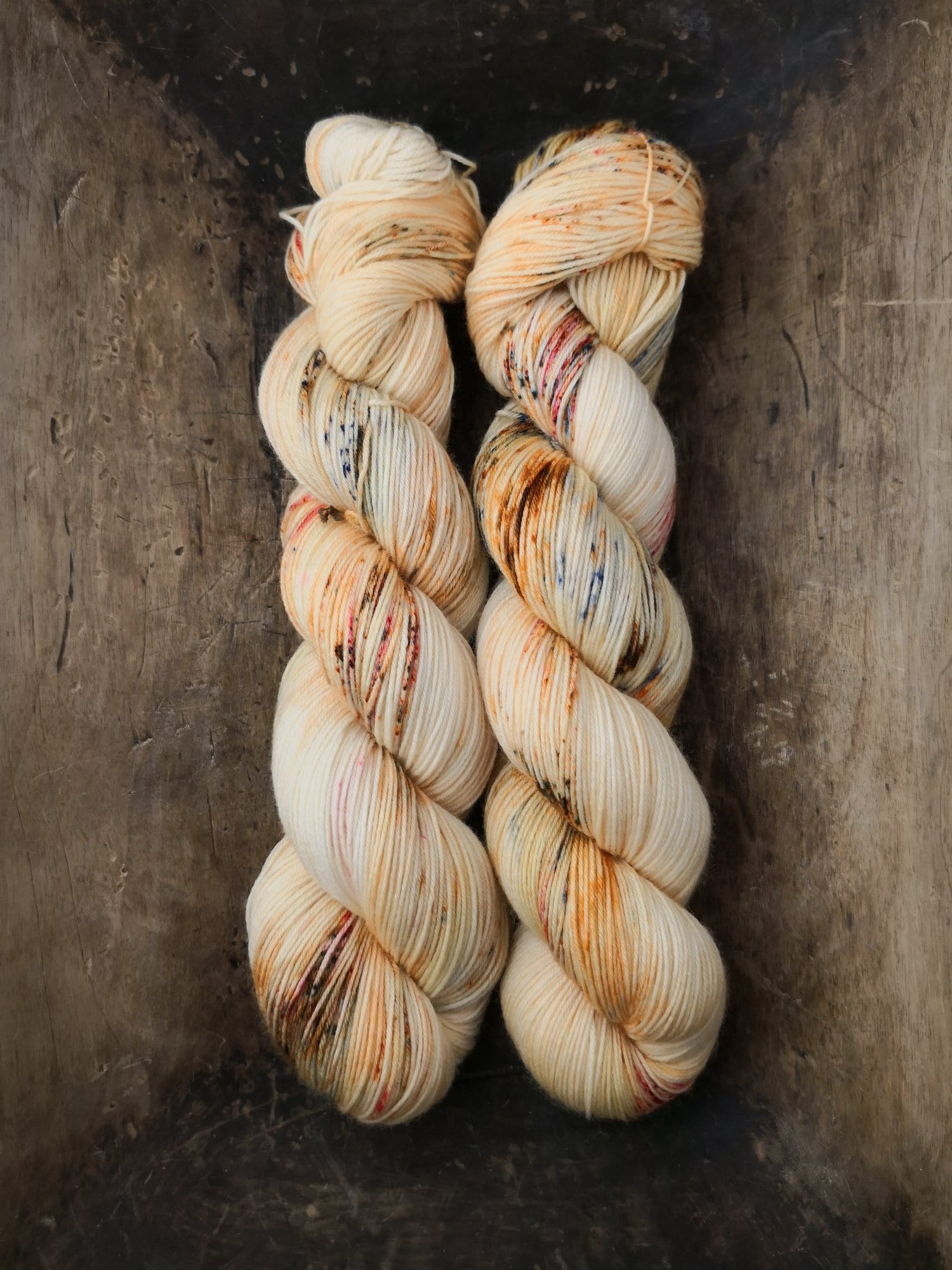 100 gram håndfarga tre-tråds garn fra Telespinn, lengde 165 meter.