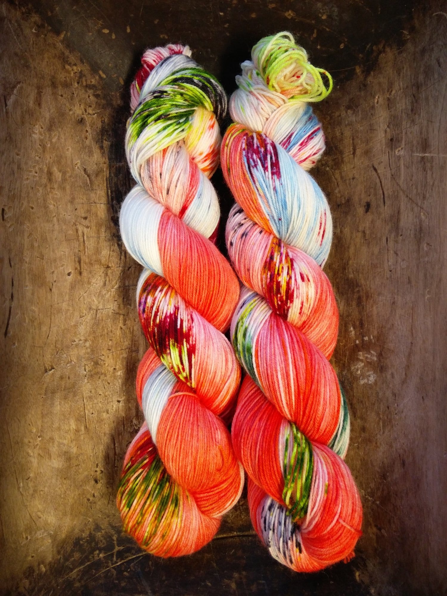 100 gram håndfarga tre-tråds garn fra Telespinn, lengde 165 meter.