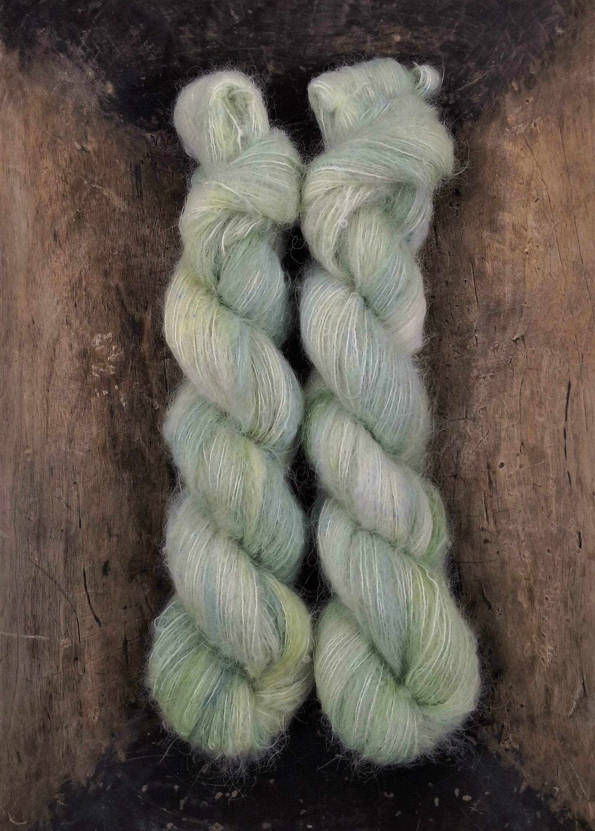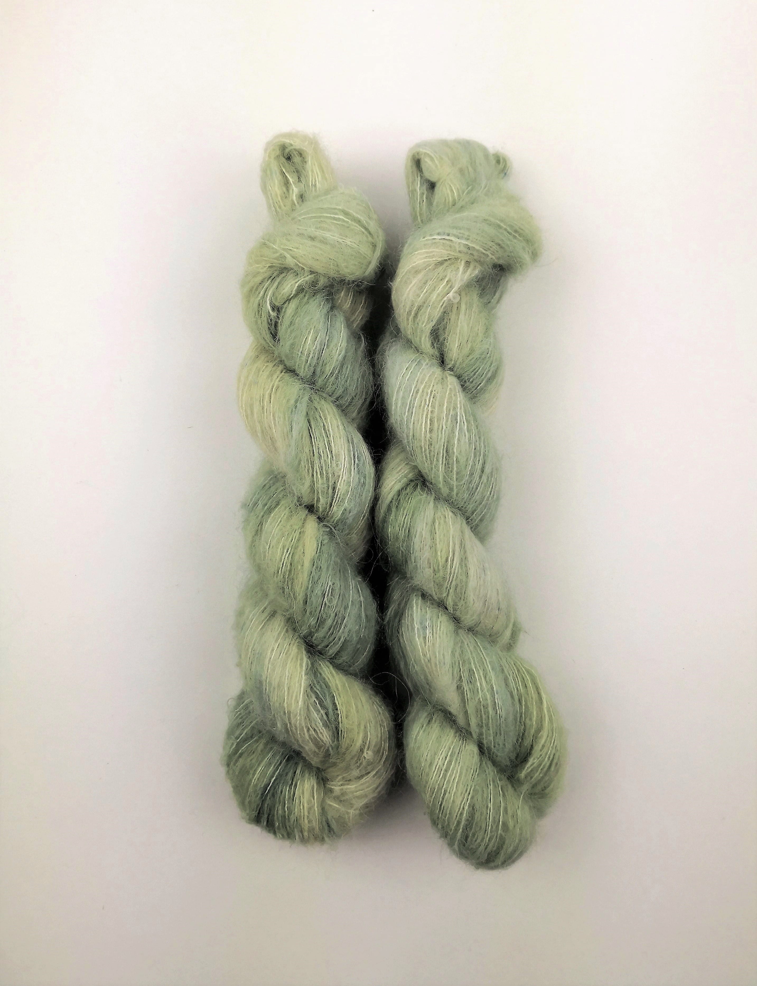 50 gram håndfarga børstet suri alpakka blandet med Mulberry silke.