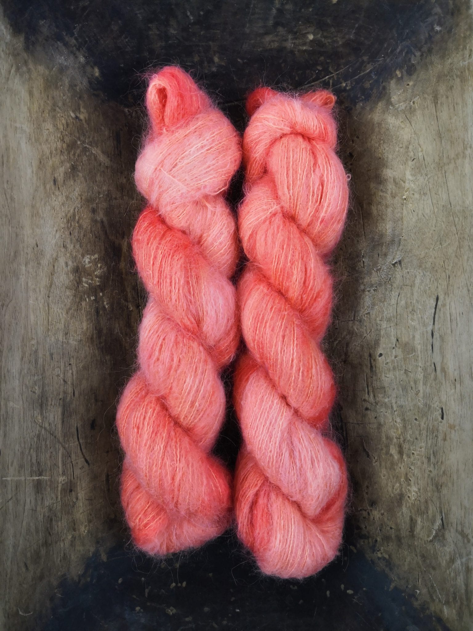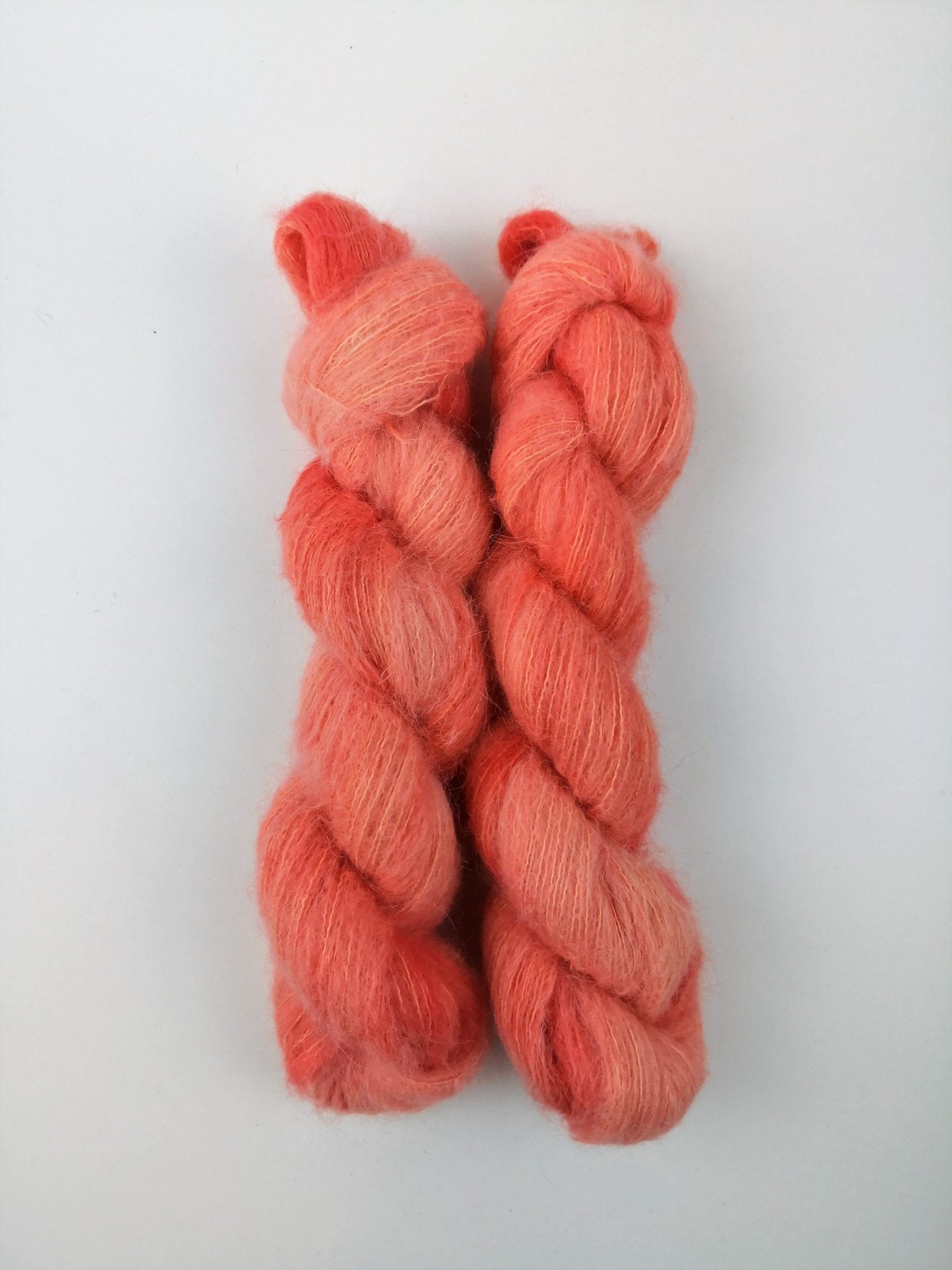 50 gram håndfarga børstet suri alpakka blandet med Mulberry silke.