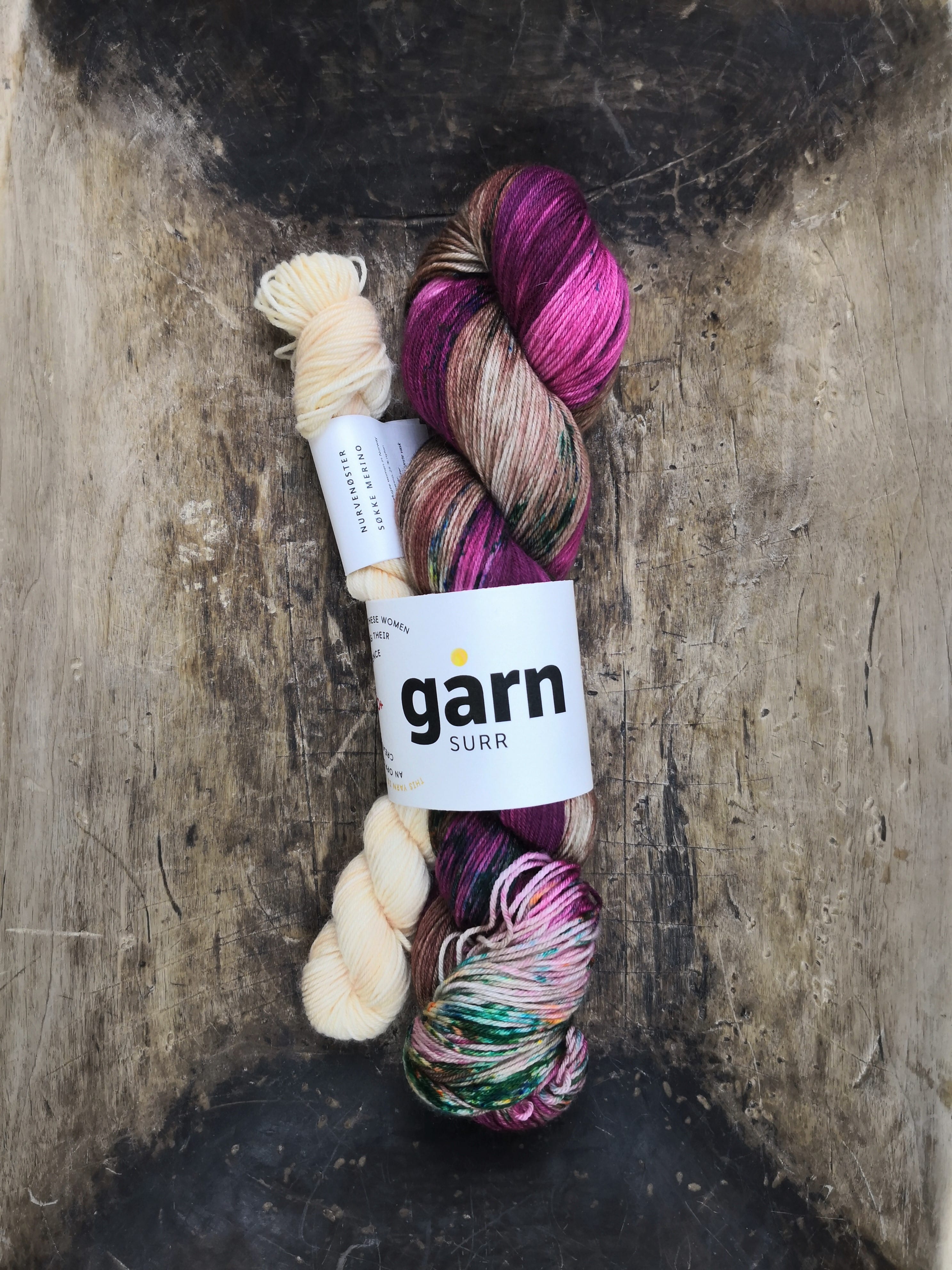 Søkketsett (sock kit) is one skein Søkke merino 100 gram and one nurvenøste (sock minis) 20 gram.